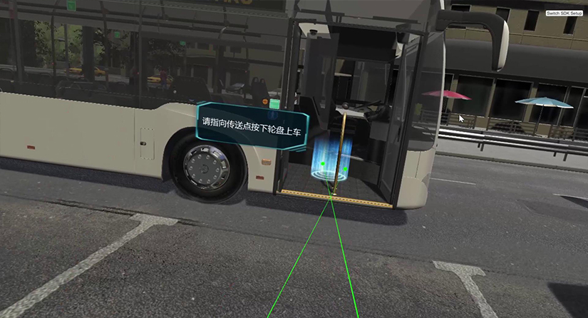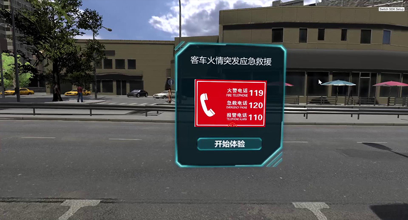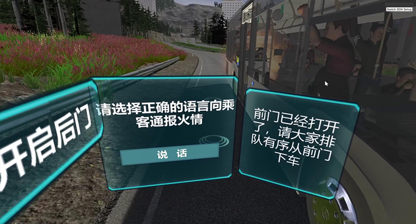 4-1、體驗(yàn)者通過位移靠近客車前門位置,通過手柄觸碰拾取駕駛座右手邊角落處的滅火器及警示標(biāo)志,畫面出現(xiàn)UI提示“滅火器與警示標(biāo)志已拾取”;