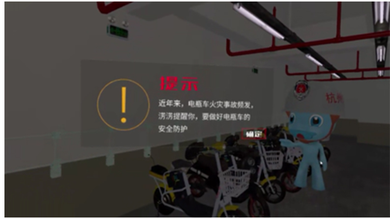 體驗(yàn)人員在地下車庫中,電瓶車突然起火,需根據(jù)火情和系統(tǒng)提示對小范圍著火進(jìn)行滅火和應(yīng)對大范圍火災(zāi)逃生。