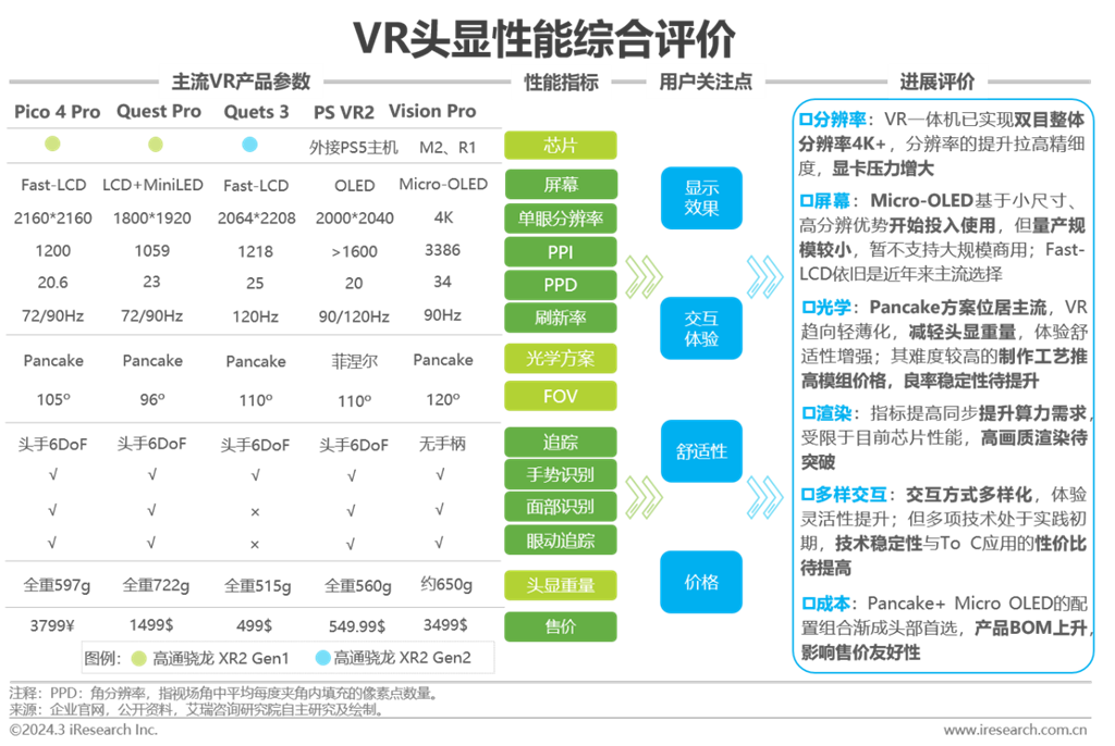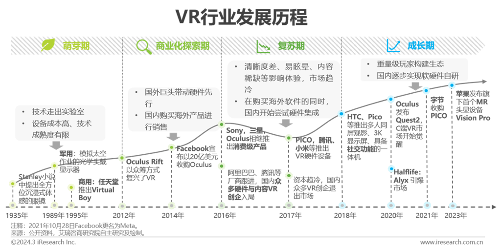 發(fā)展階段:新舊玩家推陳出新,特別是Vision Pro產(chǎn)品的問世,極大帶動行業(yè)參與者信心,行業(yè)未來發(fā)展方向漸進(jìn)明晰,新品層出不窮,VR邁入快速成長期