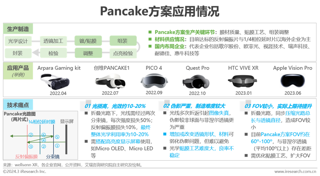 Pancake方案對頭顯的“瘦身”吸引了業(yè)內(nèi)多方的關(guān)注,近2年已有多款企業(yè)級、消費級的頭顯產(chǎn)品問世,包括蘋果推出的MR產(chǎn)品Vision Pro,再一次將Pancake帶進(jìn)大眾視野。新方案的落地為VR市場注入新鮮活力,設(shè)備迭代加速,屏幕等配套設(shè)備相應(yīng)升級,輕薄、成像質(zhì)量好的佩戴體驗進(jìn)一步促進(jìn)VR向大眾市場滲透。但Pancake方案并非十全十美,基于方案設(shè)計本身,在光效、FOV等方面有所犧牲。為提升方案的使用性能,制造工藝難度提高,成本隨之上升。故Pancake方案依舊是一個偏向過渡的產(chǎn)品形態(tài),未來一段時間業(yè)內(nèi)各方仍需在方案則選、產(chǎn)品體驗與制造成本等多因素間尋找平衡。