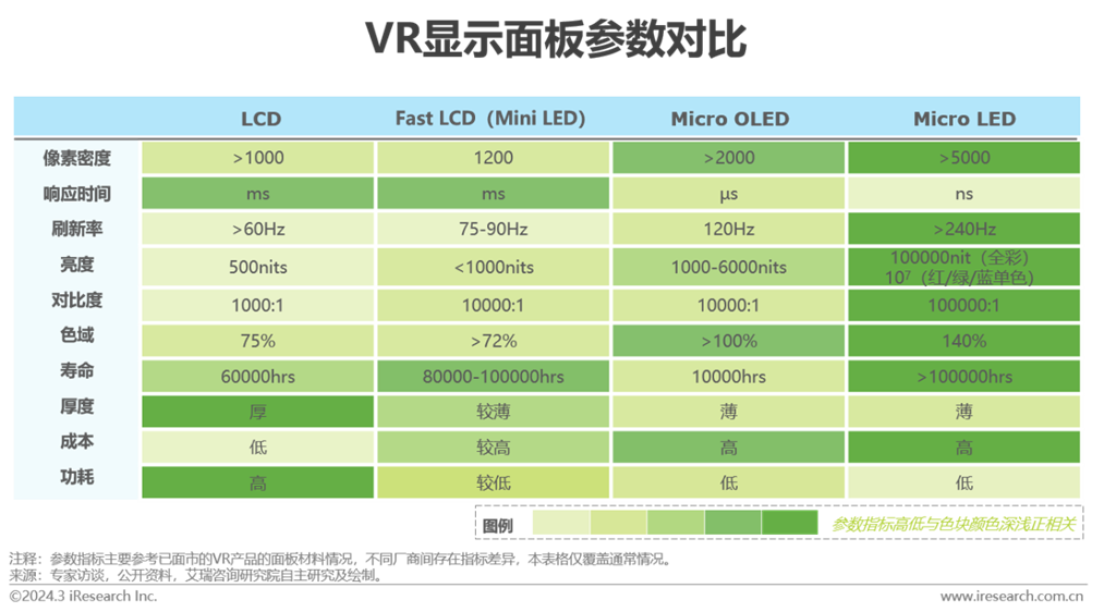 早期VR頭顯大部分采用LCD,礙于LCD響應(yīng)速度慢,從2016年起,玻璃基OLED被嘗試應(yīng)用于VR設(shè)備中。當(dāng)前的VR設(shè)備主要采用Fast LCD屏幕,該類型顯示屏在響應(yīng)速度、量產(chǎn)穩(wěn)定性、良率與成本等方面均有所改善。伴隨顯示方案的步步迭代,2022年起,VR產(chǎn)業(yè)頭部企業(yè)開始研發(fā)帶有Mini LED的Fast LCD顯示面板與Micro OLED面板,以求在對比度、刷新率、亮度、光效等方面獲得進(jìn)一步提升。顯示屏亮度與對比度的提升,更好的適配了Pancake光學(xué)方案對高亮度的需求。值得一提的是,相較于Micro OLED的性能優(yōu)勢,Micro LED在屏幕輕薄度、光效、顯示性能等方案更為出色,目前以蘋果、三星為首的企業(yè)正積極布局,是未來VR顯示面板的理想選擇。
