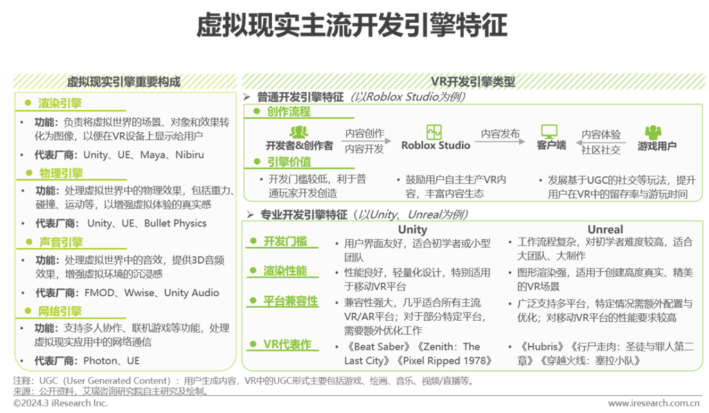 引擎平臺將軟件系統(tǒng)分解為若干功能模塊,以此來提高軟件開發(fā)效率、降低開發(fā)成本并增強軟件系統(tǒng)的可拓展性。VR產(chǎn)品強調(diào)交互體驗,開發(fā)前期需要實驗驗證,確保核心設(shè)計點符合VR場景。目前應(yīng)用于VR的開發(fā)引擎以Unity和Unreal為主,在物理模型創(chuàng)建、圖像渲染、系統(tǒng)渲染等方面具備良好性能,因為該類型開發(fā)引擎具備一定使用難度,主要供程序員、開發(fā)者等專業(yè)人員使用。近兩年來VR行業(yè)玩家均在積極推進(jìn)內(nèi)容生態(tài)的構(gòu)建,加之元宇宙產(chǎn)業(yè)的迅速發(fā)展和AIGC刮起的新一輪科技熱潮,企業(yè)鼓勵普通用戶自主生產(chǎn)內(nèi)容,并提供開發(fā)門檻較低的創(chuàng)作工具,激發(fā)玩家進(jìn)行UGC創(chuàng)作,同步強化內(nèi)容與社交生態(tài)。