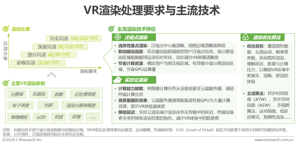 渲染處理主要涉及(1)內(nèi)容渲染:在VR環(huán)境中創(chuàng)建、生成各種元素、場景、對象與效果和(2)終端渲染:對生成的內(nèi)容進(jìn)行畸變、色散等校正并呈現(xiàn)到用戶終端設(shè)備。為匹配用戶的進(jìn)階需求,當(dāng)前的VR渲染處理已跨越初級階段向部分沉浸階段邁進(jìn),在畫質(zhì)、速度、成本等多方面尋求質(zhì)量與效率間的平衡。相較于普通的3D渲染,VR渲染注重用戶體驗的全方位性,在幀率、延遲、交互控制、立體聲視圖、性能優(yōu)化等方面均有更高要求。作為連接用戶與虛擬環(huán)境的橋梁,渲染在VR中扮演重要角色,需要高規(guī)格硬件算力設(shè)備、成熟的XR可穿戴智能終端、優(yōu)化的渲染算法及逐步系統(tǒng)化的云渲染模式等技術(shù)的協(xié)同推動。當(dāng)前階段,得益于眼動追蹤技術(shù)的成熟,注視點渲染吸引更多業(yè)內(nèi)玩家嘗試,如Quest Pro、PS VR 2、PICO 4 Pro等越來越多的VR設(shè)備已在產(chǎn)品中配置。AI算法的成熟應(yīng)用,為渲染模型提供大量圖像、視頻數(shù)據(jù),VR場景質(zhì)量更為逼真。云化架構(gòu)將渲染能力導(dǎo)入云端,云邊協(xié)同有助于降低終端配置成本,改善時延、抖動等問題。在硬件算力仍有不足的情況下,ATW、ASW等優(yōu)化算法也成為VR產(chǎn)品標(biāo)配,以降低虛擬世界的渲染復(fù)雜性,進(jìn)而緩解延遲與滯后。