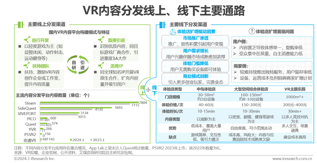 內(nèi)容分發(fā)平臺打破內(nèi)容碎片化,聚合的豐富內(nèi)容可匹配用戶不同興趣與需求。內(nèi)容分發(fā)渠道分為:(1)線上:由內(nèi)容分發(fā)平臺主導(dǎo),為用戶提供在線購買、下載和體驗服務(wù)。目前線上分發(fā)渠道以各硬件廠商自行搭建為主,暫未出現(xiàn)第三方內(nèi)容分發(fā)平臺布局。從內(nèi)容數(shù)量角度,國外平臺占主導(dǎo)地位,其中Steam作為傳統(tǒng)游戲平臺,憑借多年積累優(yōu)勢,VR內(nèi)容數(shù)量一路領(lǐng)跑;國內(nèi)VR應(yīng)用商店加速追趕,盡管內(nèi)容體量仍無法同海外頭部廠商抗衡,但通過自研與引進(jìn)兩種模式,內(nèi)容量快速擴充。數(shù)量并非絕對標(biāo)志,但多樣選擇為呈現(xiàn)優(yōu)質(zhì)內(nèi)容提供更大可能。(2)線下:多指B to C線下游藝門店,以VR體驗店為主。伴隨疫情開放,線下娛樂由停滯狀態(tài)開始不斷回溫,逐漸受到更多關(guān)注;如能有效緩解用戶與商家側(cè)面臨問題,VR體驗店有望成為VR產(chǎn)品出貨的重要支撐。