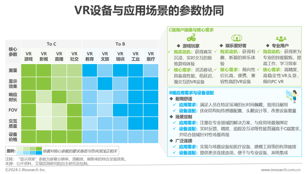 對于消費級領(lǐng)域,游戲是VR在C端落地最早且相對成熟的場景,VR游戲用戶的行業(yè)教育程度最深,導(dǎo)致其對VR產(chǎn)品及服務(wù)的敏感性增強。行業(yè)后續(xù)衍生的C端場景中,直播、社交等聚焦動態(tài)與實時交互的細(xì)分應(yīng)用對響應(yīng)時長、交互質(zhì)量更為關(guān)注。VR影視更多依賴預(yù)先開發(fā)內(nèi)容,應(yīng)用重點在于展示。對于行業(yè)級領(lǐng)域,工業(yè)、醫(yī)療等技術(shù)門檻高的場景較為關(guān)注VR設(shè)備的可操作性,因而與應(yīng)用效果直接關(guān)聯(lián)的各項參數(shù),均為該場景的關(guān)注重點。在教育、培訓(xùn)等場景,VR技術(shù)與產(chǎn)品的應(yīng)用價值多體現(xiàn)為對行業(yè)工作模式的創(chuàng)新改革,領(lǐng)域用戶對VR技術(shù)、服務(wù)性能容忍度更高。