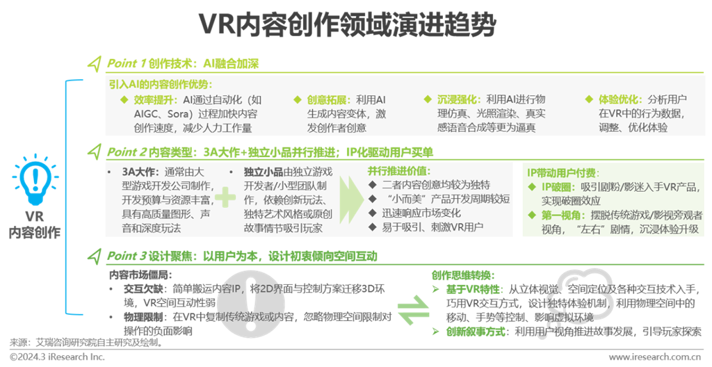 以AIGC為代表的自動生成式技術(shù)的出現(xiàn),不僅對于VR行業(yè),為整個數(shù)字內(nèi)容產(chǎn)業(yè)的創(chuàng)作突破帶來多樣可能性。AI技術(shù)的引入可以加快復(fù)雜虛擬環(huán)境的開發(fā)效率,同時提升動態(tài)生成角色行為、動畫的模擬程度,提高VR內(nèi)容演繹的真實性。將AI作為工具,不僅可以輔助創(chuàng)作者進(jìn)行構(gòu)思,兼顧優(yōu)化創(chuàng)作成本,一定程度緩解了現(xiàn)階段VR內(nèi)容開發(fā)成本高的困境。在內(nèi)容類型方面,大型制作和小型精品都將是未來VR內(nèi)容的布局重點。VR對于用戶的吸引更多在于其新穎與創(chuàng)新,因此開發(fā)者需要不斷擴充內(nèi)容數(shù)量并提高質(zhì)量來不斷刺激用戶,保持用戶對于VR的新鮮感。在目前VR代表作品較為匱乏的階段,化用IP資源引流將是短期更多玩家實踐的方向。過去的創(chuàng)作者受限于傳統(tǒng)游戲、影視注重畫面的開發(fā)思路而忽視了VR交互特性,未能充分的發(fā)揮VR特性讓用戶體驗到其特性。未來的創(chuàng)作將以VR特性為基點,強化用戶第一視角玩家的體驗。