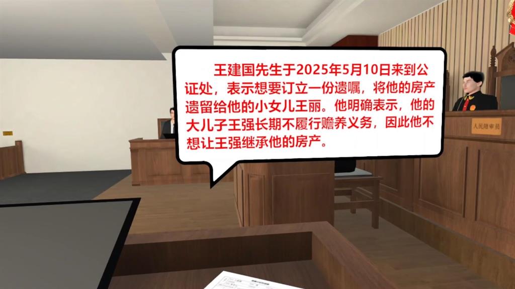 模擬成為一位公證員,體驗遺囑公證、出庭作證等公證業(yè)務(wù)流程,讓用戶在虛擬環(huán)境中深入了解公證業(yè)務(wù)的各個過程,提高業(yè)務(wù)理解和操作能力。體驗完成后將進行答題測試,以檢驗用戶對公證流程的理解程度及法律知識掌握情況。