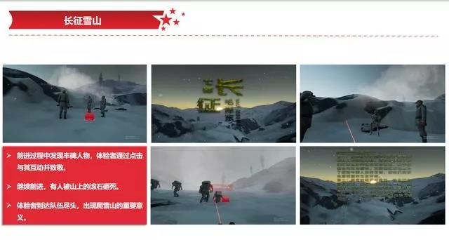 工作人員戴上VR眼鏡,可以重溫長征路,體驗當年農(nóng)軍爬雪山的艱難。在雪山體驗場景里,你將扮演一名紅軍戰(zhàn)士,在行進過程中遇見戰(zhàn)友滑到,遇見體力不支餓暈在路旁的同志,還會遇見教科書本上為了革命而犧牲的軍需處長。這些原本在教課書上發(fā)生的故事情節(jié),通過VR我們蹦栩栩如生在眼前展示。