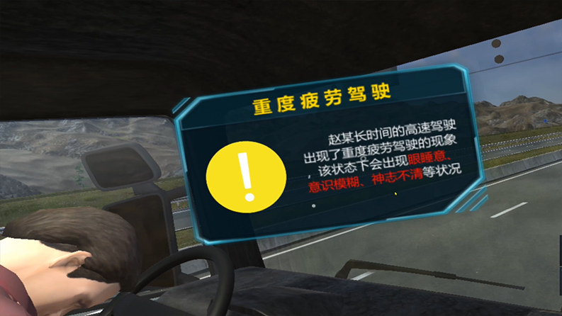 隨著夏季高溫和物流旺季的到來(lái),疲勞駕駛問(wèn)題日益突出,尤其是對(duì)于夜間行駛的貨車(chē)駕駛員。駕駛員在疲勞的情況下駕駛車(chē)輛,會(huì)感到困倦瞌睡,四肢無(wú)力,注意力不集中,判斷能力下降,甚至出現(xiàn)精神恍惚或瞬間記憶消失,出現(xiàn)動(dòng)作遲誤或過(guò)早,操作停頓或修正時(shí)間不當(dāng)?shù)炔话踩蛩?,極易發(fā)生道路交通事故。體驗(yàn)者將會(huì)體驗(yàn)到在高速上體驗(yàn)到輕微疲勞駕駛、中度疲勞駕駛、重度疲勞駕駛以及疲勞駕駛應(yīng)急處理措施等。